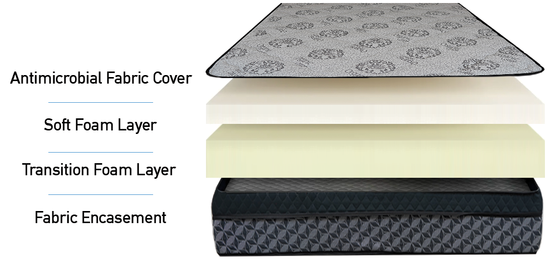 Our Cozy Cloud mattress is an industry leading all foam mattress. It contains a three inch soft pillow top with a medium soft foam base. A soft filled quilted top provides an additional layer of comfort.