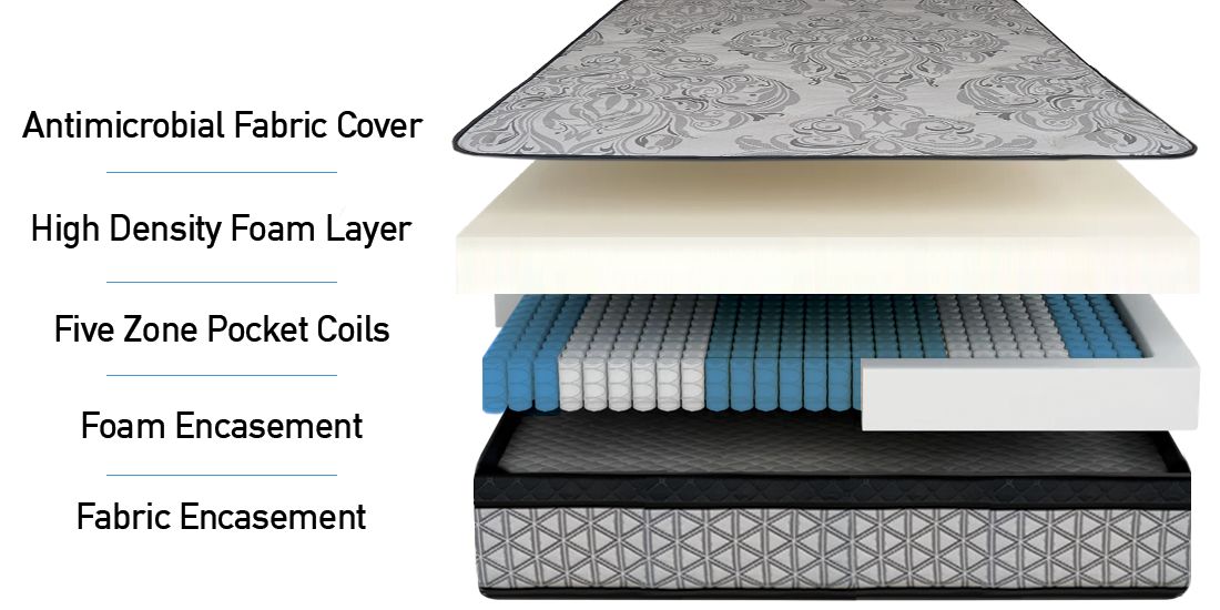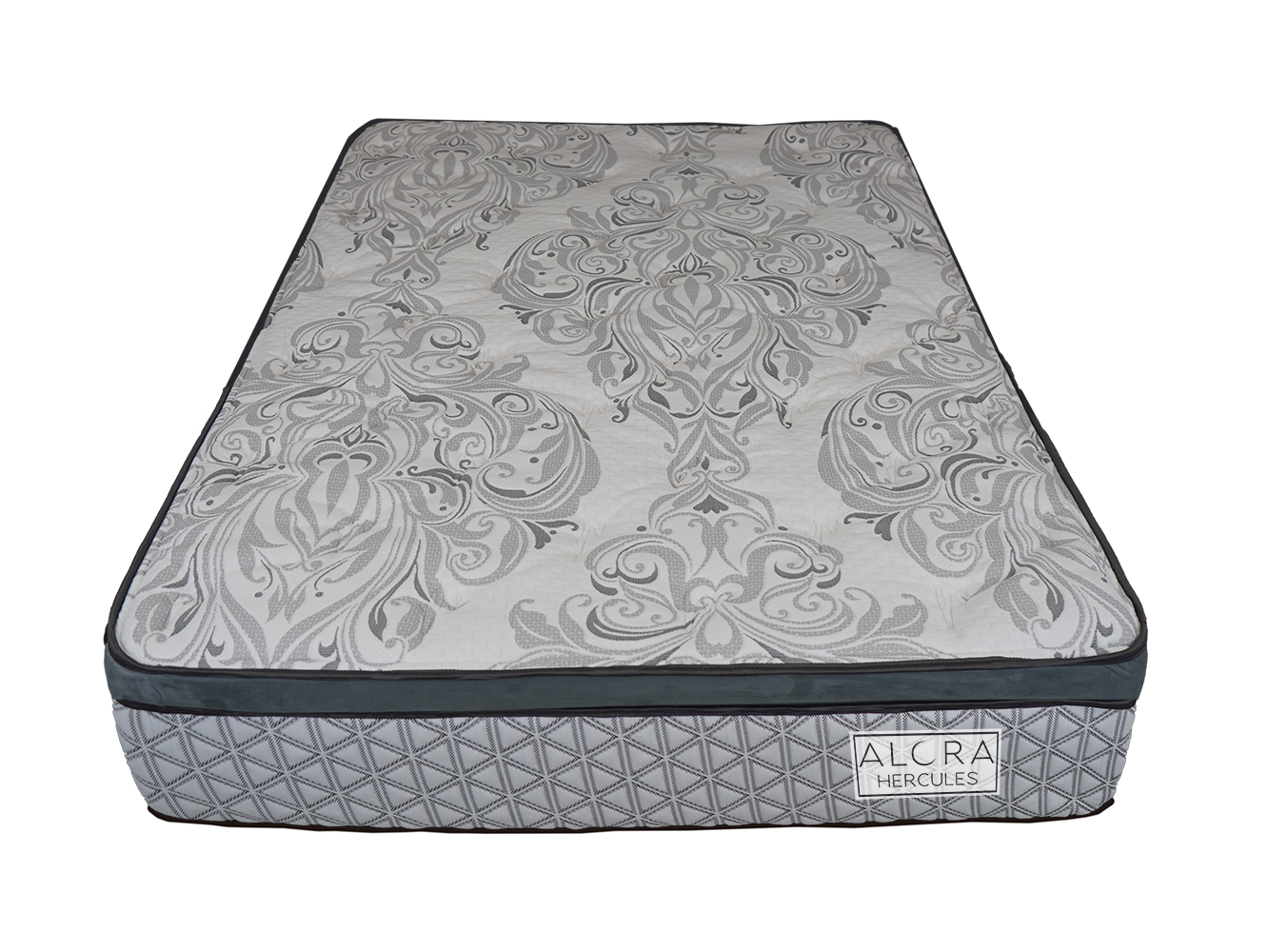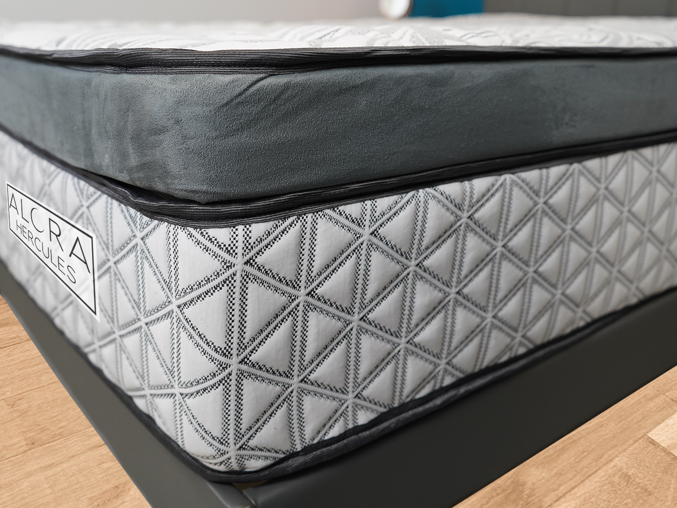 The Hercules mattress is a firm five zone pocket coil with a large four inch pillowtop. It features a quilted top designed to dissipate body heat and a firm foam encasement around the pocket coils provides support to the sides to prevent sagging when sitting on the edges.